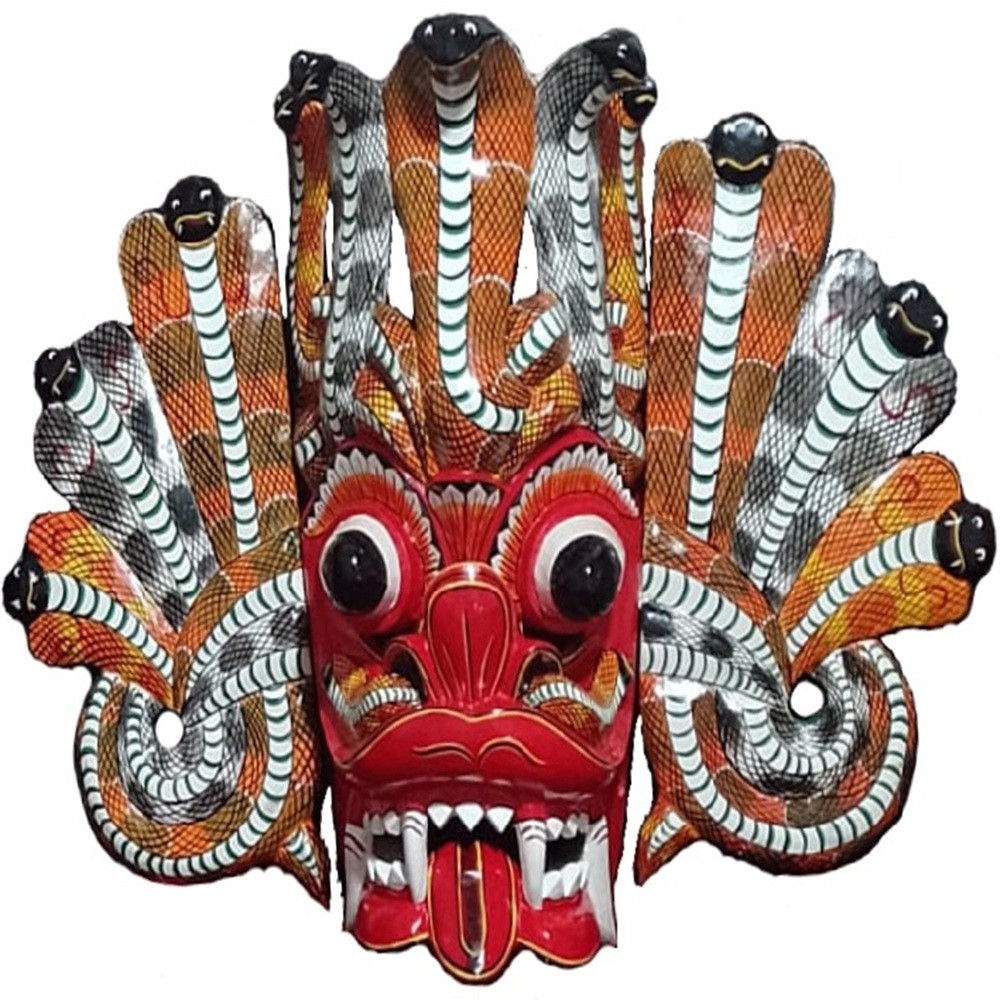 Naga Raksha Mask (Cobra Demon Mask) The Naga Raksha Mask is one of the most famous traditional Sri Lankan masks, representing the mythical cobra demon. It is handcrafted from light wood (usually Kaduru wood), skillfully carved and brightly painted by local artisans. The mask features striking cobra hoods rising above the head, symbolizing power, protection, and spiritual strength. Traditionally, these masks are used in Sri Lankan dance rituals, folk dramas, and cultural performances to ward off evil spirits and bring good fortune. Today, Naga Raksha Masks are also popular as decorative art pieces and souvenirs, showcasing Sri Lanka’s rich cultural heritage. Material: Kaduru wood (lightweight & eco-friendly) Origin: Handmade in Sri Lanka Use: Cultural performances, home décor, souvenirs, gifts