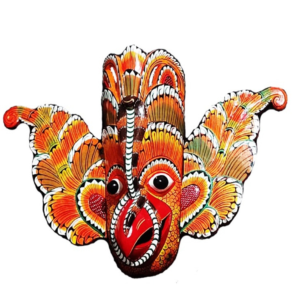 Gurulu Raksha Mask (Mythical Bird Demon Mask) The Gurulu Raksha Mask is a traditional Sri Lankan mask that depicts the mythical bird demon “Gurulu,” believed to have the power to drive away evil spirits. It is beautifully hand-carved from light Kaduru wood and painted in vivid colors, featuring large wings, a fierce beak, and intricate decorative patterns. In Sri Lankan culture, the Gurulu Raksha Mask symbolizes protection, strength, and spiritual guardianship. It is often used in folk rituals, dance performances, and healing ceremonies. Today, it is also cherished as a unique cultural art piece and a striking home décor item. Material: Kaduru wood (lightweight & eco-friendly) Origin: Handmade by Sri Lankan artisans Use: Rituals, cultural performances, home décor, souvenirs